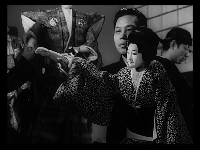 Quasi come marionette i cui fili sono tenuti da un destino ineluttabile, Jihei e Koharu non hanno infatti altro metodo di lotta che la morte, sfidando così le convenzioni sociali dell'epoca. E che i due amanti siano burattini è evidente non soltanto dalla natura dell'opera stessa, quanto dalla mise-en-scène del film, spiazzante sotto molti punti di vista. Tutta la scena si svolge su di un palco unico, dove scenografie girevoli possono spostarci da una casa di piacere ad un negozio di carta. La presenza dei kuroko (黒子) [9] in scena accentua la sensazione di trovarsi seduti in platea, ad assistere ad una pièce teatrale. Ma i kuroko per Shinoda non sono soltanto meri aiutanti di scena. Certo, essi si occupano del cambio di scenografia, delle parti declamatorie, aiutano Osan a disfare il suo guardaroba, ed armano la mano incerta di Jihei, ma soprattutto essi sono spettatori di una trama a cui partecipano, impossibilitati a svolgere qualsiasi ruolo diverso da quello che gli è proprio. I continui primi piani che la regia gli dedica mostrano volti tristi, addolorati, consapevoli della tragedia che si sta consumando davanti ai propri occhi, e consapevoli di non poter far nulla per evitarla.